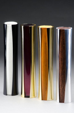 Diese Kundensonderanfertigung, besteht aus 3 Teilen. Die äußere Spange ist aus Messing, diese erhält durch eine hochglanz Polierung einen wunderschönen goldenen Schimmer. Die mit der Messing-Klammer umfaßte Aluminium-Röhre ist aus Aluminium und mit einer matten Bürstung veredelt. Der Sockel ist aus Aluminium, der mit einer schwarzen Pulverbeschichtung beschitet ist.