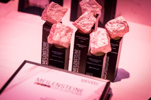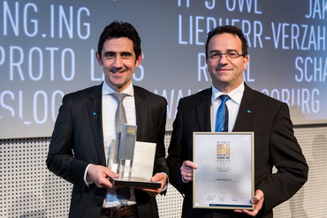 The award is an exclusive special design for Kosmos. It consists of a crystal cube, which is individualized with a 3D laser engraving. The night blue glow of the awards is from a slide cover on the back of the crystal cube. The crystal cube is connected to an aluminum block, which is finished with a shiny gold coating. A digital color print on the aluminum block shows the client's logo.